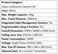 The CL-1201 Video Conference Camera Lift is a ceiling-mounted, motorized camera lift designed to completely conceal your video conferencing camera within a recessed ceiling enclosure. Perfect for conference rooms, boardrooms, and professional video calls, it delivers a sleek, clutter-free ceiling while protecting your camera when not in use.